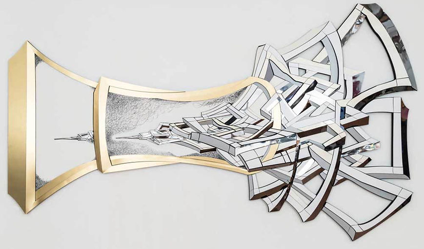 Moment of Expansion (2014) HDU, Trupan, Metal and Plastic Laminates, Flashe Paint, Charcoal, 108 x 192 x 3 inches